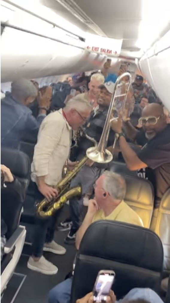 A video of them performing Stevie Wonder's "You Haven't Done Nothin'" went viral on social media. It shows Koz and fellow saxophone player Marcus Anderson grooving in the aisle with other horn players behind them, as well as Jeff Bradshaw on trombone getting creative to play the large instrument between seats. Passengers are seen smiling and swaying in their seats, with some recording the performance on their phones.