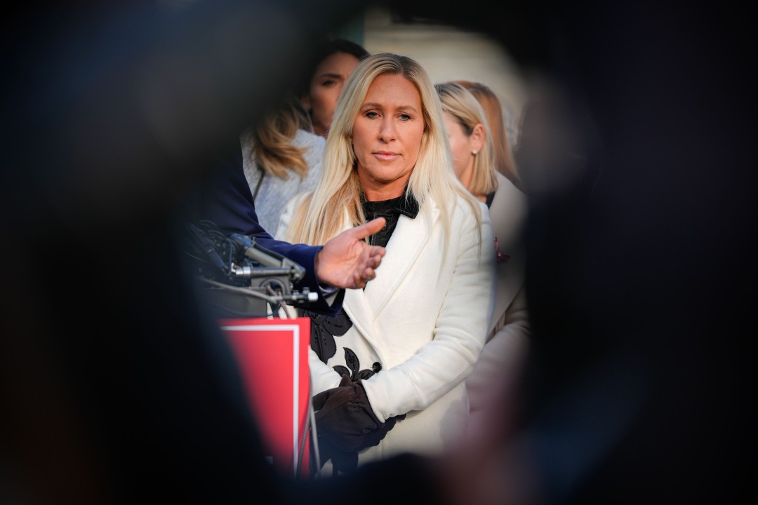 Rep. Marjorie Taylor Greene, R-Ga., center, attends a news conference on the Epstein Files Transparency Act, Tuesday, Nov. 18, 2025, outside the US Capitol in Washington.   (AP Photo/Julia Demaree Nikhinson)